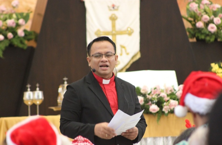 Di momen ini Pdt. Benget Tambunan hadir di depan jemaat dan tamu undangan menyampaikan renungan Natal malam itu yang mengingatkan para lansia untuk selalu hidup berpengharapan kepada Kristus.
