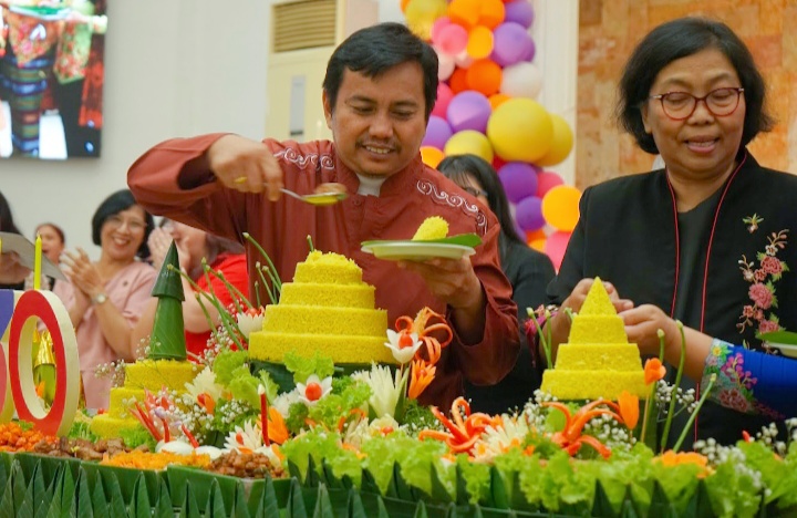 Ibadah syukur yang juga menghadirkan PS Calvary dan PS Perempuan ini kemudian dilanjutkan dengan seremonial pemotongan tumpeng oleh dua pendeta GKI Pamulang, Pdt. Rahmat Basukendra dan Pdt. Iswari Setyanti. Tumpeng berukuran besar yang dipersiapkan secara khusus oleh panitia itu kemudian dibagikan kepada Pdt. Debora, Kezia Annora Tassayu, dan beberapa pengurus komisi dan karyawan gereja serta dua anggota jemaat senior oleh kedua pendeta. Dalam sambutannya, Ketua Panitia HUT dan Bulan Keluarga 2025, Nola Simanjuntak, menyampaikan tiga program yang diusung panitia tahun ini, yakni “Spiritual, Relasional dan Sosial” yang masing-masing dilaksanakan dalam berbagai bentuk acara sejak dan menjelang ulang tahun dan sepanjang Bulan Keluarga pada Oktober 2025 (21 kegiatan) di bawah tema besar “Dipandu Kristus, Melangkah dalam Kasih.”