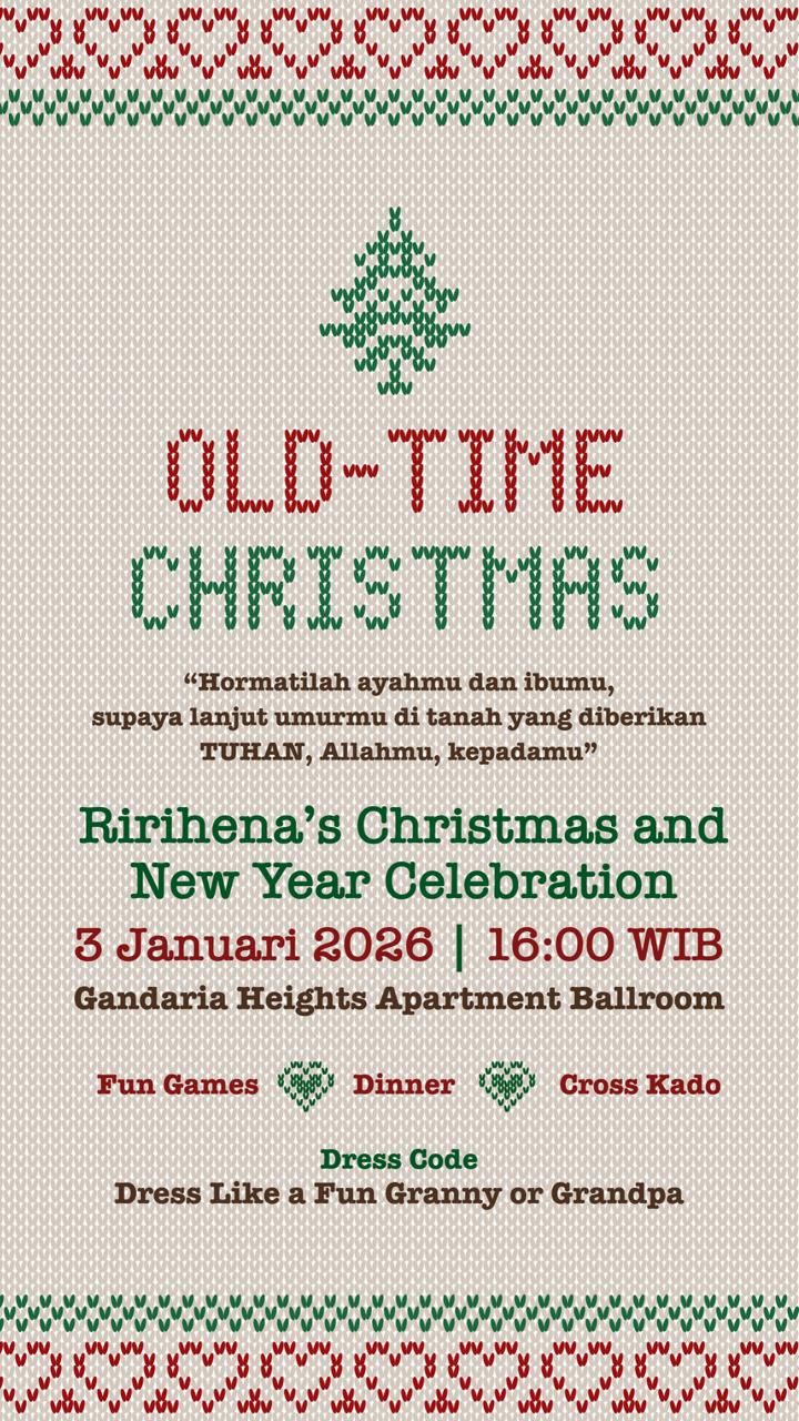 Ada yang mengenakan syal, baju hangat, topi opa-opa, bergaya menghisap cerutu, juga berjalan menggunakan tongkat. Bahkan, sebagian besar yang hadir sore itu mewarnai rambutnya beruban. Hari itu keluarga besar Ririhena, anak cucu cicit almarhum Hendrik Johannes Ririhena dan Selvisina Anom kembali berkumpul dalam Natal tahunan yang rutin diadakan. Tahun ini “Old Time Christmas” dipilih menjadi tema dengan latar belakang adanya kerinduan dari generasi muda Ririhena saat ini untuk mengingatkan kepada generasi penerus mereka, bahwa kebiasaan-kebiasaan baik yang dilakukan orang tua mereka selama ini dalam keluarga besar dapat dimengerti dan diterapkan dalam keberlanjutan hidup mereka sebagai generasi penerus Ririhena.
