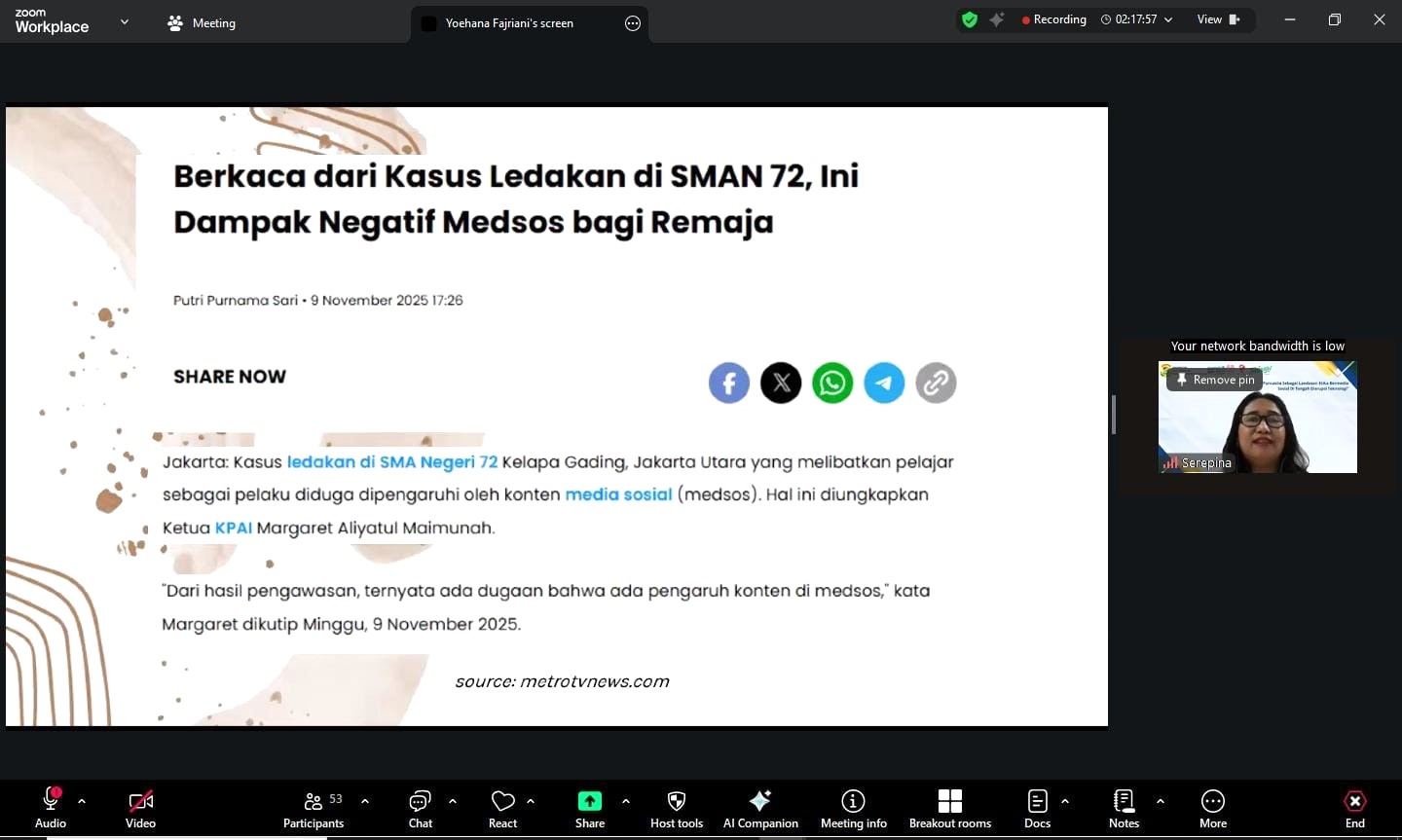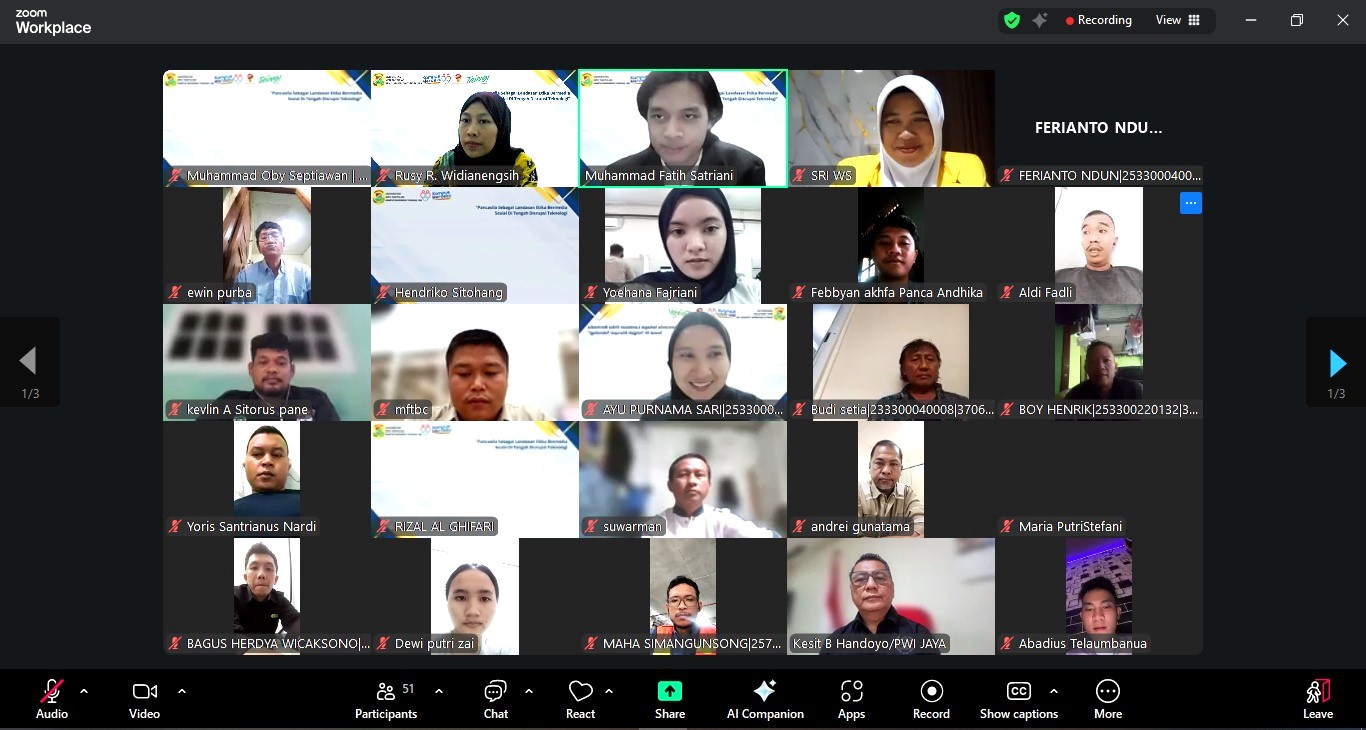 Sementara itu, Serepina menekankan etika bermedia sosial bukan hanya tanggung jawab pemerintah atau media, tetapi juga seluruh pengguna internet. Nilai-nilai Pancasila seperti kemanusiaan, persatuan, dan keadilan sosial dinilai relevan sebagai pedoman bersikap di dunia digital. Kegiatan webinar ini dipandu oleh Sri dan Fatih diikuti oleh peserta dari berbagai latar belakang, termasuk mahasiswa, dosen dan masyarakat umum. Diskusi berlangsung interaktif dengan sesi tanya jawab yang membahas praktik bermedia sosial yang bijak dan beretika.