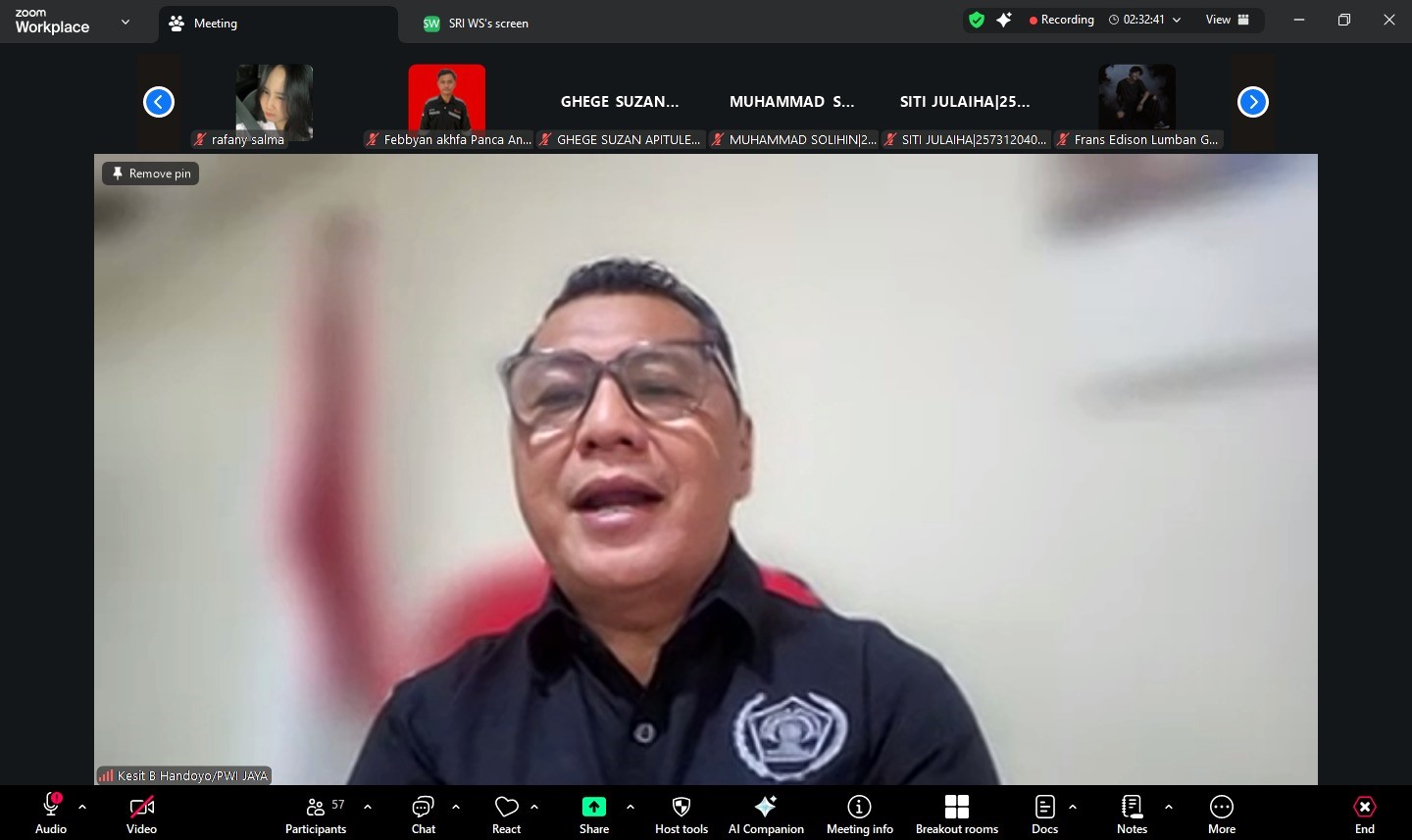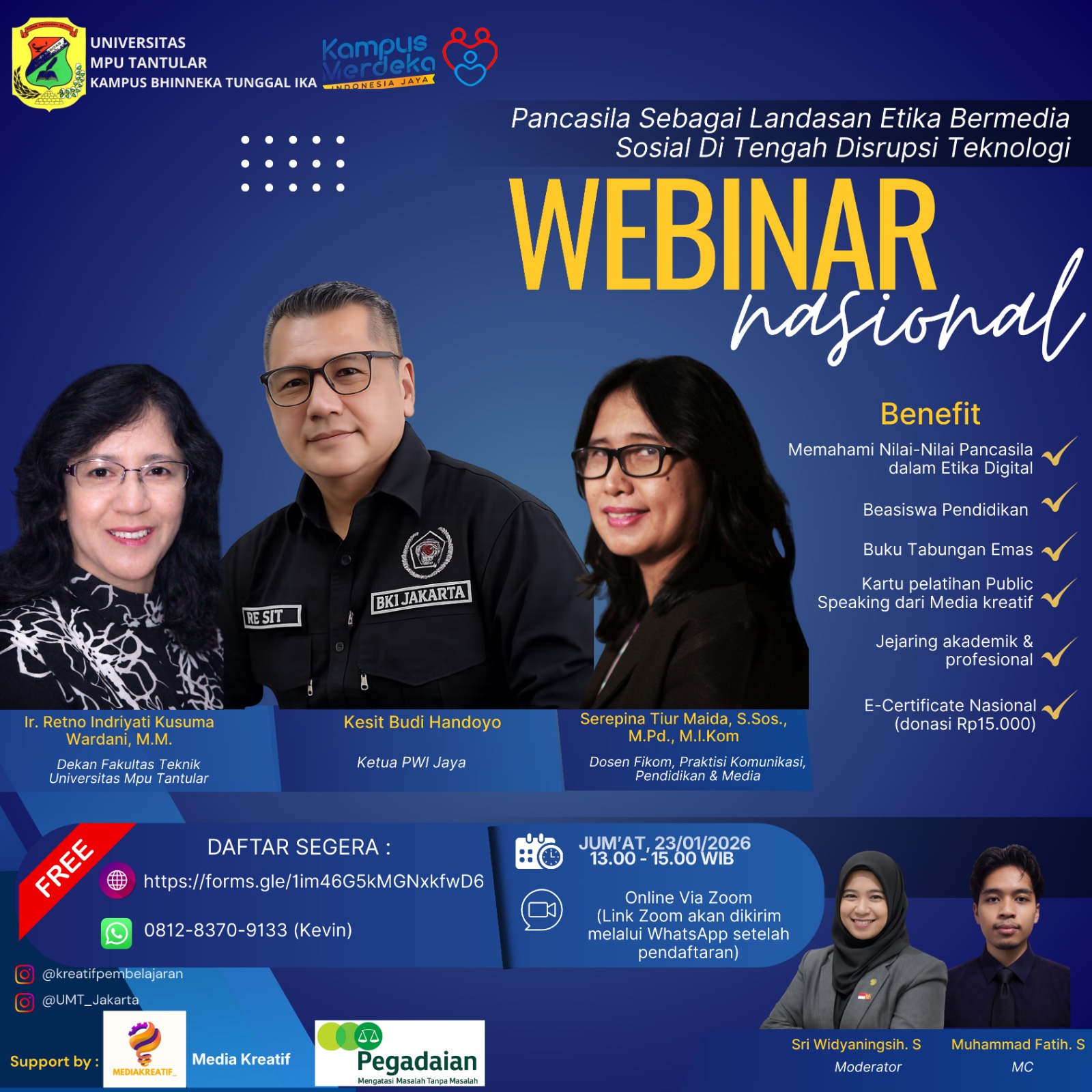 Webinar ini menghadirkan Kesit Budi Handoyo (Ketua Persatuan Wartawan Indonesia/PWI Jaya) sebagai narasumber utama, bersama Serepina Tiur Maida (Praktisi Komunikasi, Pendidikan dan Media), yang mengulas tantangan dan tanggung jawab masyarakat digital di era ketika 82 persen populasi Indonesia telah terhubung dengan internet. Angka tersebut menunjukkan tingginya aktivitas masyarakat di ruang digital, sekaligus menegaskan urgensi penerapan nilai-nilai Pancasila dalam berinteraksi di media sosial.
